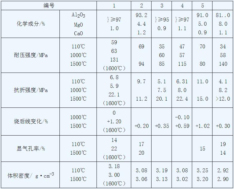 從表中看出,低水泥鋁鎂質耐火澆注料的性能是優良的。MgO含量不大于8%,與Al2O3 的含量為89% ~ 97.6%,說明材料優良;燒后線變化均為正值,氣孔較低,強度較高,有利于澆注料的使用。