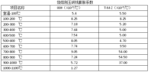 2.00# 燒結(jié)剛玉磚熱膨脹系數(shù)與溫度之間呈直線關(guān)系,在砌筑時(shí)僅考慮 0.8~1.0%的線膨脹率。T-M-Z燒結(jié)剛玉磚的線膨脹系數(shù)與溫度之間的關(guān)系不很硅鋁,在700~800℃,800~900℃、900~1000℃之間有突然膨脹現(xiàn)象,但其最大線膨脹率在1.086%,烤窯時(shí)應(yīng)注意。