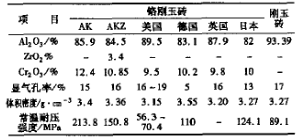 鉻剛玉系列產(chǎn)品所用原料是由氧化鋁和氧化鉻按一定比例配比,經(jīng)過高溫熔化合成的一種固溶體。采用特種耐火材料生產(chǎn)工藝制成耐火磚,可以改善和提高制品的內(nèi)在質(zhì)量,提高制品的高溫性能。我廠開發(fā)生產(chǎn)的部分高性能鉻剛玉磚(AK、AKZ)的理化性能指標(biāo)與國(guó)外部分同類產(chǎn)品及剛玉磚的性能比較見表1。