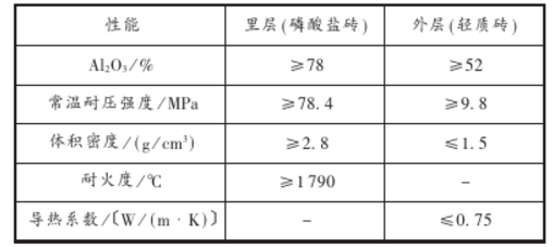 我們選用鄭州駒達(dá)新材料科技有限公司生產(chǎn)的隔熱耐火復(fù)合磚作為試驗(yàn)襯料。磚的外層屬于輕質(zhì)磚。和筒體緊密接觸,具有隔熱保溫性能;里層為磷酸鹽磚,和物料接觸、具有耐磨性能。其各項(xiàng)理化指標(biāo)如表1。