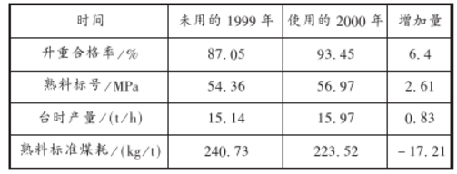 由于平時(shí)產(chǎn)量的提高,2000年較1999年多產(chǎn)熟料6544t,創(chuàng)經(jīng)濟(jì)效益19.6萬元;由于煤耗的下降,2000年較1999年節(jié)煤1809t,創(chuàng)經(jīng)濟(jì)效益41.6萬元。兩項(xiàng)合計(jì)共創(chuàng)經(jīng)濟(jì)效益61.2萬元。