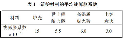 為方便比較,以爐底 Ф10000 mm 的爐底,爐底炭素層厚度1400 mm,炭塊400mm×400mm×1200 mm,膨脹縫50mm△LC = 0.2%,爐底溫度1200 ℃為探討依據。各種材料的0~1200 ℃平均線膨脹系數見表 1。
