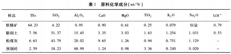 研究從現場取樣見表1鐵精礦取自現場高壓輥磨預處理后,從成分可知混合精礦鐵品位較高(TFe為64.23%),雜質元素含量較低;膨潤土為球團生產常用的粘結劑,含有較高的堿金屬氧化物;粉煤灰為現場取得的煤粉經燃燒后所得,可見其中SiO2和AL23O的含量很高,分別達到了43.788%和 28.023%,另外堿金屬K20和 Na20的含量也較高。預制磚為高鋁質耐火材料(AL2O3為 68.99%),為氧化球團回轉窯內常用的耐火制品,其他雜質含量低,含少量K2O,不利于提高預制磚的耐火度。