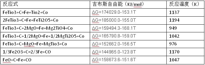 鈦渣是一種高熔點的爐渣。鈦渣熔體具有強腐蝕性、高導電性和黏度變化劇烈的特點。鈦渣 的主要成分是TiO,此外還含有相當數量的低價鈦氧化物(Ti3O5、Ti2O3TiO)和鐵氧化物(FeOFe2O3),因而具有極高的化學活性。鈦渣電爐的爐內最高溫度可達2073K,在這樣高的溫度下,它們幾乎能與所有的金屬和非金屬材料發生化學反應。事實上,工業生產時作為工作層的爐襯無論采用哪一種耐火材料,都會被鈦渣熔體所腐蝕,嚴重時甚至出現爐墻穿孔等生產事故。以常見的鎂質或碳質耐火材料為爐襯時,熔煉鈦渣時熔池內的熔液與爐襯耐火材料發生的主要化學反應和標準吉布斯自由能方程式見表1所示。