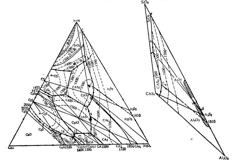 現(xiàn)有的低水泥、超低水泥耐火澆注料,在基質(zhì)部分基本上是引人硅灰來(lái)實(shí)現(xiàn)降低水泥含量的,而所有加人硅灰的高鋁質(zhì)低水泥、超低水泥耐火澆注料,其熱態(tài)1300℃抗折強(qiáng)度都非常低,僅為0~3MPa。如果不考慮成分中等雜質(zhì)的影響,高鋁質(zhì)耐火澆注料即屬于C-A-S系統(tǒng),其工藝組成靠近A-S二元邊。從C-A-S三元相圖中高鋁質(zhì)耐火材料區(qū)可以看出,該材料