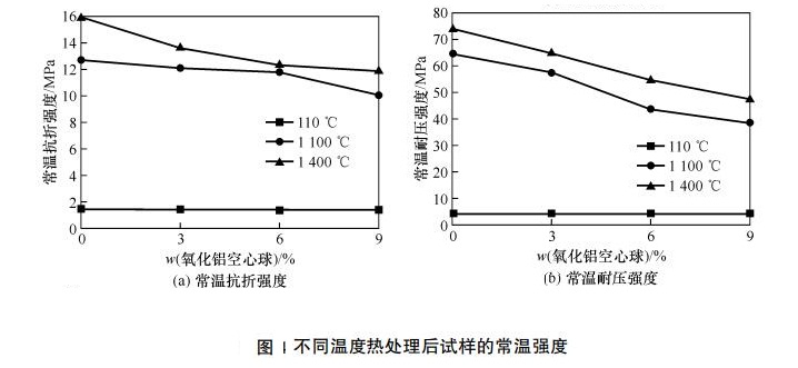 1示出了不同溫度熱處理后試樣的常溫強度。從圖中可以看出,試樣的常溫強度隨氧化鋁空心球加入量的增加而降低。同時,隨著熱處理溫度升高,試樣的常溫強度逐漸增大。當氧化鋁空心球加入量為9%,1400熱處理后試樣的常溫抗折強度和常溫耐壓強度分別為11.947.1MPa.110 烘干后試樣的強度主要由莫來石骨料的本征強度提供。但基質與細粉的結合強度并不高,故此時常溫耐壓強度較低。經1400高溫處理后,骨料和微粉間燒結作用使得澆注料中的顆粒之間結合更加緊密,且氧化鋁微粉和二氧化硅微粉反應生成莫來石,提高澆注料強度然而,由于氧化鋁空心球取代了部分骨料,增加試樣的氣孔率,導致力學強度下降。 但氧化鋁空心球提高了莫來石的生成量,且氧化鋁空心球的多孔結構能夠阻礙裂紋擴展,故其強度下降較少。