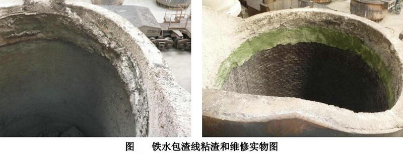 下圖示出了鐵水包渣線磚粘渣和清渣后維護(hù)情況。鐵水包渣線存在粘渣現(xiàn)象,嚴(yán)重時(shí)影響
